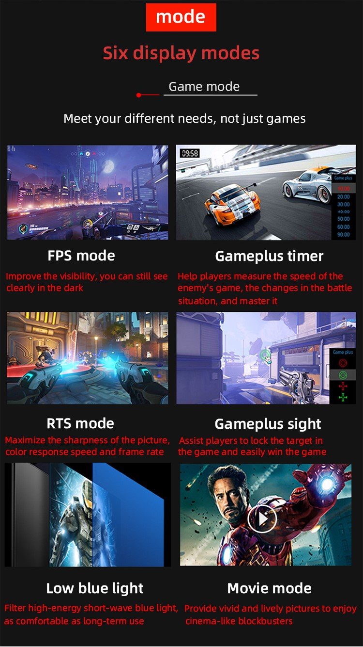 AMD Free Sync / ضوء أزرق منخفض / زاهٍ للغاية / خالٍ من الوميض / الشعر المتقاطع / محرك فوقي