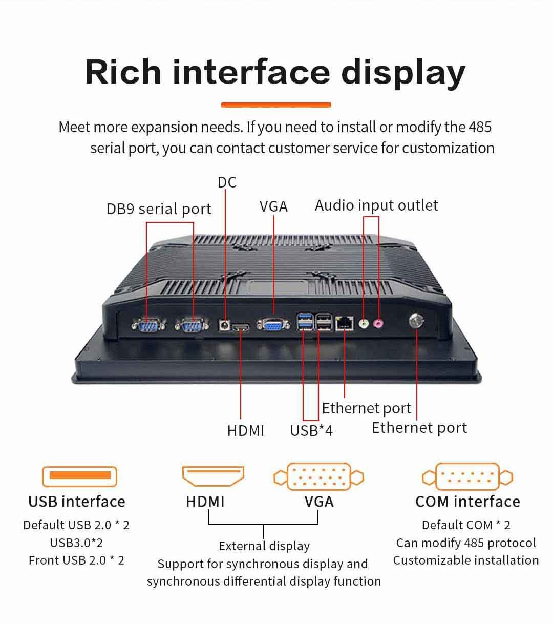 | واجهه المستخدم | 2 X DB9 المنفذ التسلسلي 1 x العاصمة 1 × HDMI 1 x VGA 1 x USB*2 1 X Ethernet Port 1 X منفذ إدخال الصوت |