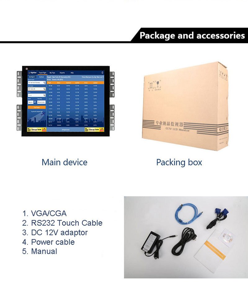 Adaptador de corriente, cable de alimentación, Convector VGA / CGA, Cable de pantalla táctil RS232 / USB |